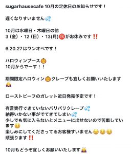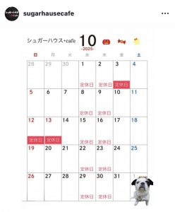 それではシュガーハウス+Caféさんの10月の定休日を公式より引用させていただきます。