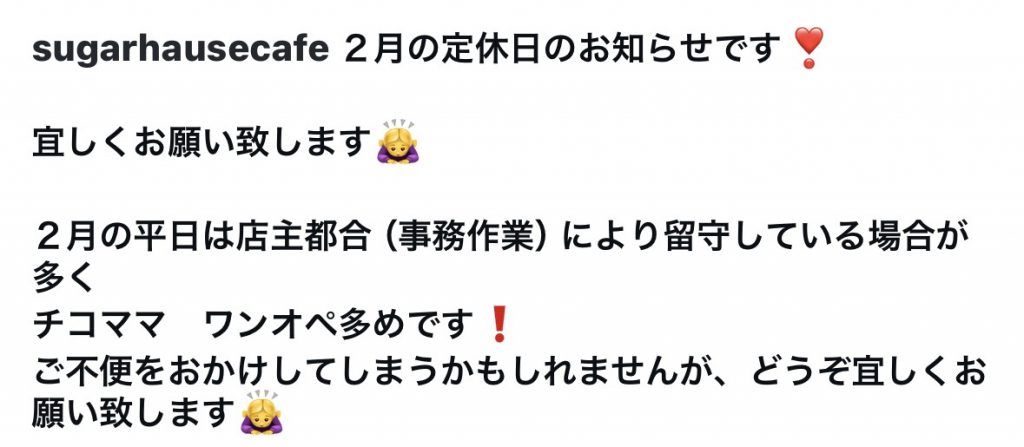 シュガーハウス+Caféさんの2月営業日のお知らせです。